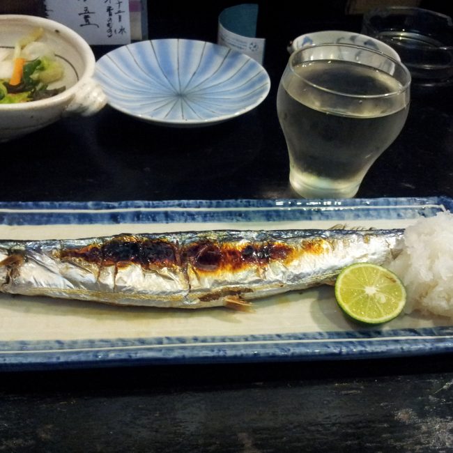 枝豆や漬物でビールを飲んだ後、待望のさんまを注文。飲み物は「浦霞」にチェンジ。